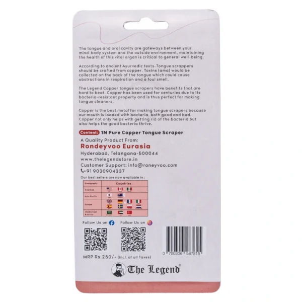 Tongue scraping (Jihva Prakshalana) has been practiced for thousands of years in Ayurveda and Wes first mentioned in the ancient texts “Charaka Samhita” and “Bhvaprakasa”. Toxins (Ama) would be collected on the back of the tongue that could cause obstructions in respiration and result in a foul smell. Tongue scraping should be done daily to ensure the stimulation of the internal organs. Improve digestion, strengthen appetite, and enhance the taste of food while increasing clarity of the mind and your spiritual awakening by reducing ama. Copper has been used for centuries due to its anti-bacterial property and thus it is ideal for making tongue scraper